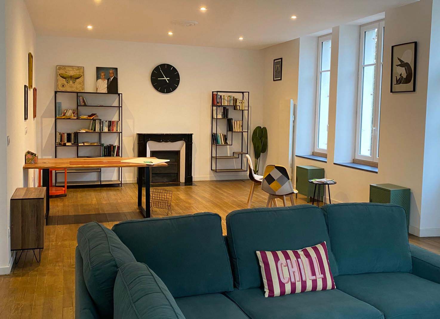 Salon/séjour lumineux de 46m²(canapé 8 places, coin salon de lecture / bureau, bibliothèque) avec 2 balcons.